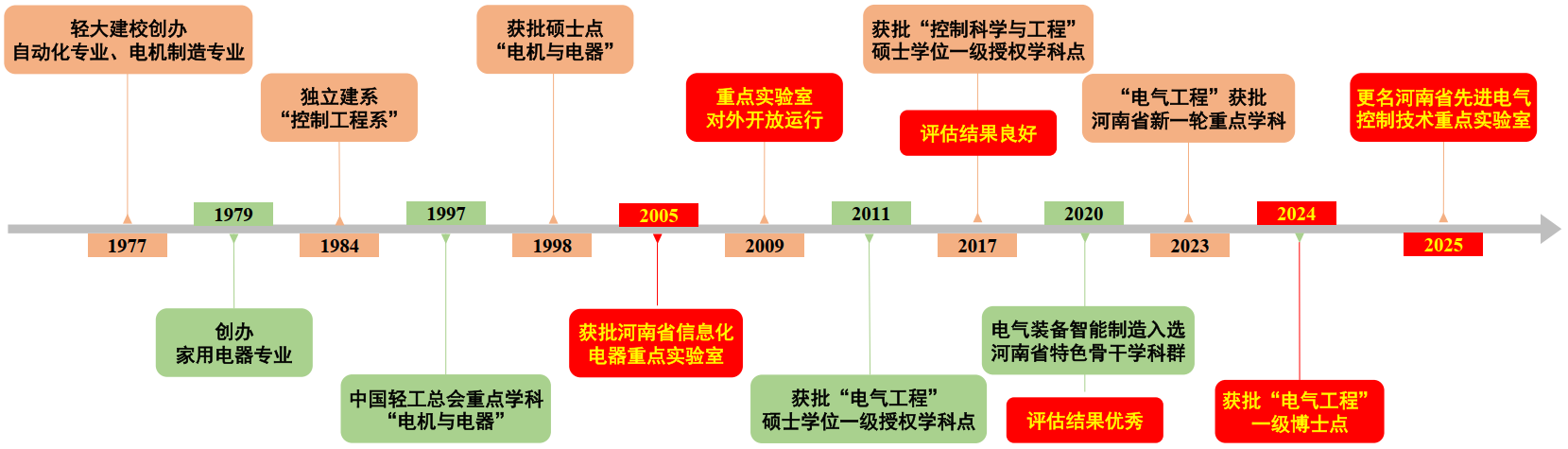 河南省先进电气控制技术重点实验室(前身为河南省信息化电器重点实验室)的历史可追溯至1996年成立的“郑州轻工业学院模糊控制技术中心”及国家原轻工总会“电器”重点实验室;其后于2005年经河南省科技厅批准筹建,2009年通过验收并对外开放运行。在后续发展过程中,实验室依托郑州轻工业大学“电气工程”、“控制科学与工程”等省级重点学科平台持续建设,历经多次评估,科研实力与人才培养能力稳步提升,并于2024年支撑“电气工程”学科获批一级博士学位授权点。为契合科技发展趋势与产业升级需求,实验室于2025年完成优化重组,正式更名为“河南省先进电气控制技术重点实验室”,标志着其进入以先进电气控制技术为核心的研究新阶段。